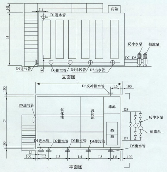 5、滤池具有重力式及抽滤式两种过滤方式,能达到节能及延长工作周期的目的。